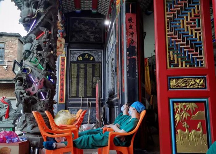 一夜奮戰,為了能更好的完成任務,他們在現場只是短暫的休息,精疲力盡的醫護人員們躺在簡易的凳子上休憩的畫面讓人久久難忘,以天為被,以凳子為床,穿著防護服,戴防護面罩及手套,雖然是秋天,福建的天氣也是非常悶,汗水早已浸透他們的衣裳。有的醫生奮戰一天一夜,早已體力透支,卻仍不愿離開現場去補眠,為莆田人民群眾的健康保駕護航。